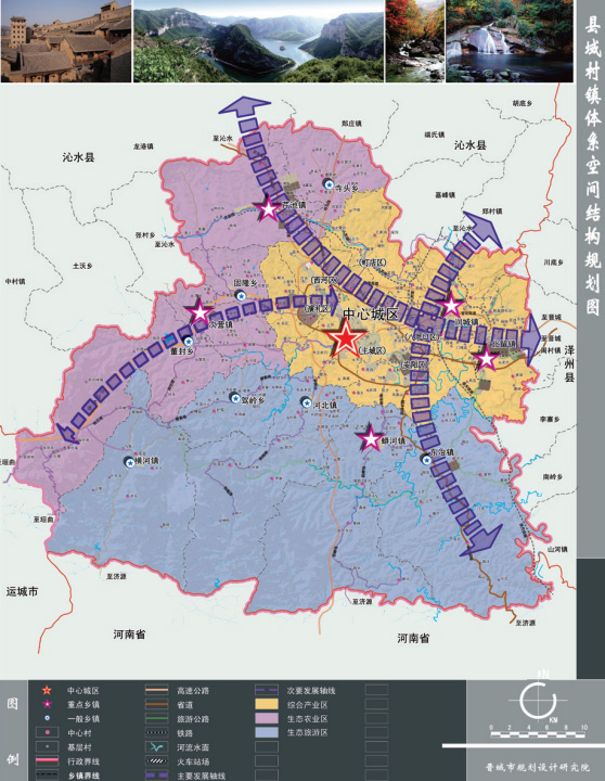 規(guī)劃按照“非均衡集中式”的城鎮(zhèn)化發(fā)展策略,以“1+5”大縣城為城鎮(zhèn)化核心區(qū)域,著力提升重點(diǎn)城鎮(zhèn)的城鎮(zhèn)綜合承載能力,推進(jìn)縣域城鎮(zhèn)化發(fā)展質(zhì)量和水平。規(guī)劃提出“工業(yè)向園區(qū)集中,農(nóng)民向集鎮(zhèn)集中,農(nóng)地向規(guī)模生產(chǎn)專業(yè)戶集中”的集約型城鎮(zhèn)化道路。在產(chǎn)業(yè)發(fā)展方面,提出了“以煤為基、多元發(fā)展”的產(chǎn)業(yè)發(fā)展路徑,構(gòu)建“1+4” 產(chǎn)業(yè)空間布局,盡快擺脫一煤獨(dú)秀的發(fā)展格局。在村莊建設(shè)方面,按照因地制宜、分類指導(dǎo)的原則,將縣域村莊分為城鎮(zhèn)拉動(dòng)型、交通引導(dǎo)型、工礦型、特色旅游型、特色農(nóng)業(yè)型等五個(gè)類別,通過(guò)撤遷并轉(zhuǎn)等模式,減少村莊數(shù)量,擴(kuò)大中心村規(guī)模,完善村莊設(shè)施,改善村民生產(chǎn)生活條件。